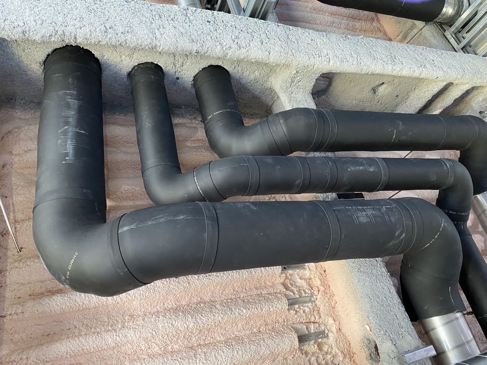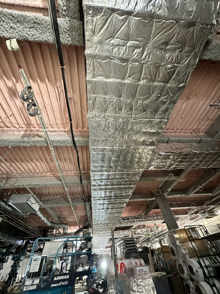 遮音・消音工事とは、配管やダクトなどから発生する音を遮断する工事です。吸音に優れたグラスウール・ロックウールを取り付けることで音を吸収し、遮音に優れた遮音シート・鉛シートで被覆することで防音効果を高めます。