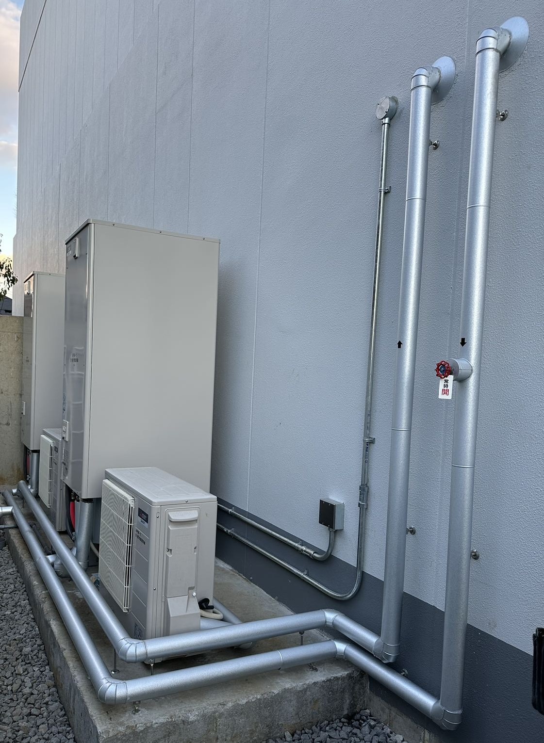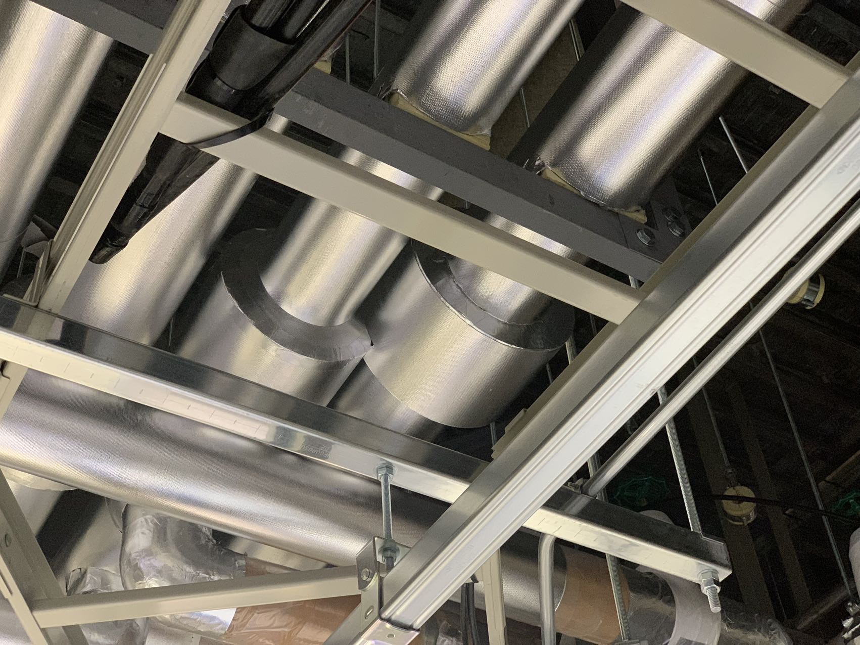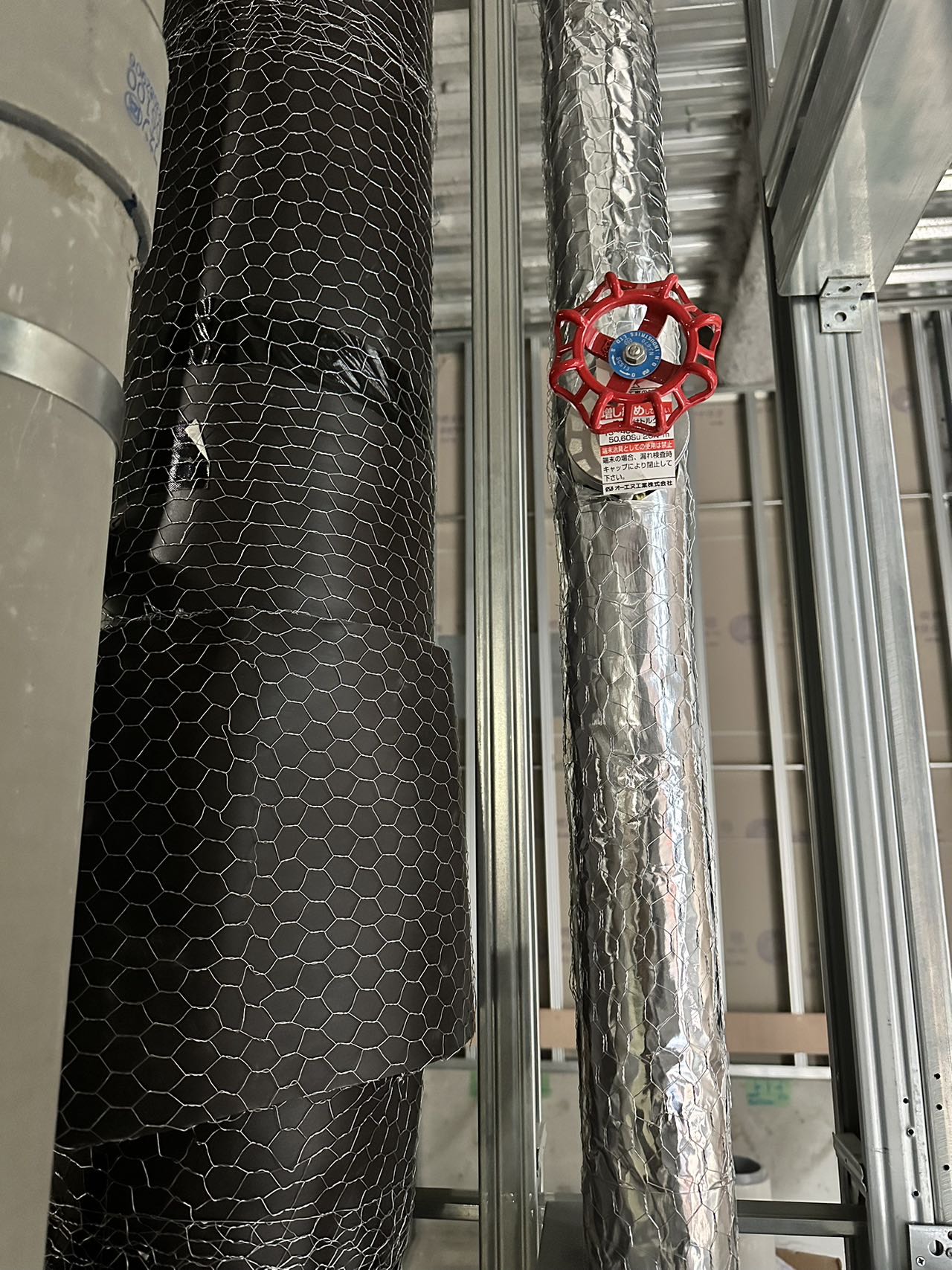 「屋内外の配管やダクト、機器類などの保温劣化を防止する為の工事」のことです。保温工事で配管やダクト、機器類などに取り付けた断熱材の上から薄い金属の板状の材料で巻くことで、断熱材や配管、ダクト、機器類を保護する役割があります。